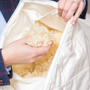 Our wool pillows offer comfort and support like no other. A 100% organic cotton pillow case is stuffed full of pure little wool balls. There is a zipper allowing you to take out any surplus wool in order to give you the firmness you require. Not only do we offer a fully adjustable pillow but an organic wool and cotton quilted protector comes with it completely FREE OF CHARGE. This is detachable for washing and for those away from home nights where you want a bit of home comfort. Just slip it over your hotel pillow and you can drift off like you would at home!